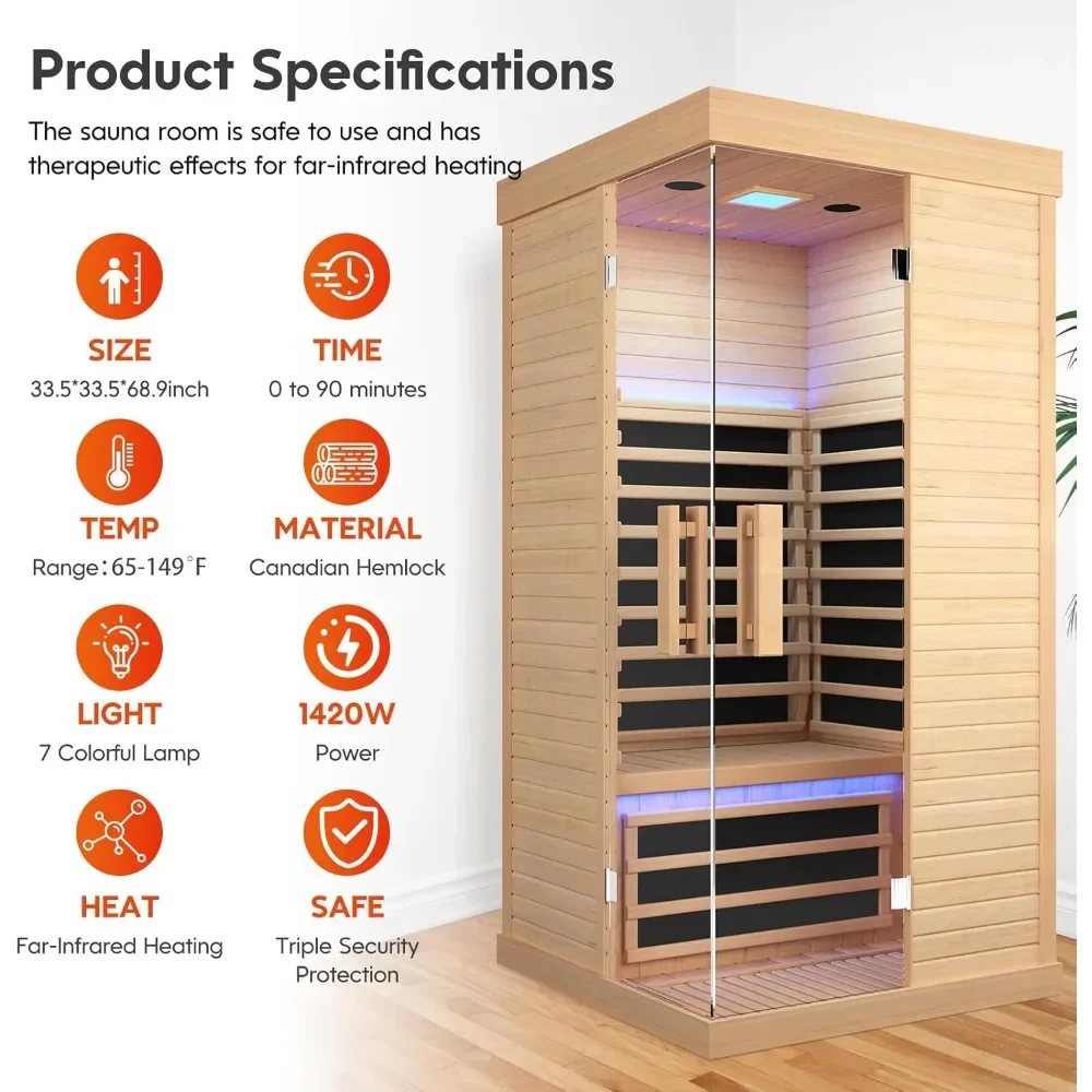 Far Infrared Saunas for Home Indoor Room 1 Person Wood Canadian Hemlock 1420W Low-EMF Dry Sauna with Oxygen Bar