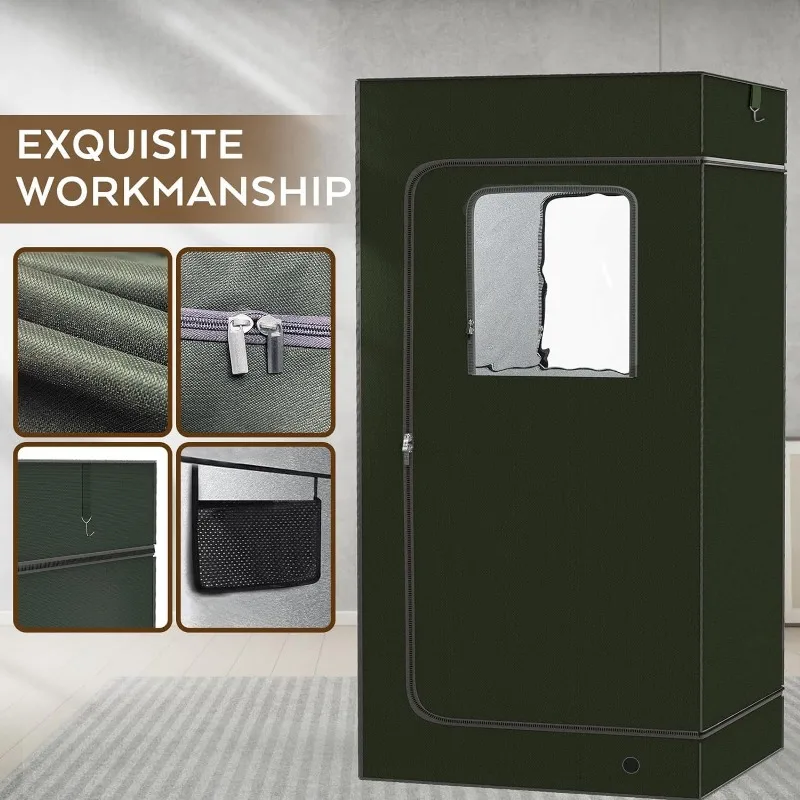 - 【LARGE SIZE & EASY TO INSTALL】- The portable steam sauna box assembly size (L x W x H) : 31.5*31.5*70.87 inch. The portable steam sauna box is assembled in less than 10 minutes. The steam sauna tent are designed with double-sides zippers to access to the sauna tent easily. Pockets under the window of the sauna tent are designed to store remote controls and mobile phones. Convenient for you to adjust the temperature and time. The hook design at the top helps you secure the door of the sauna tent.